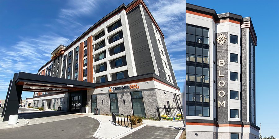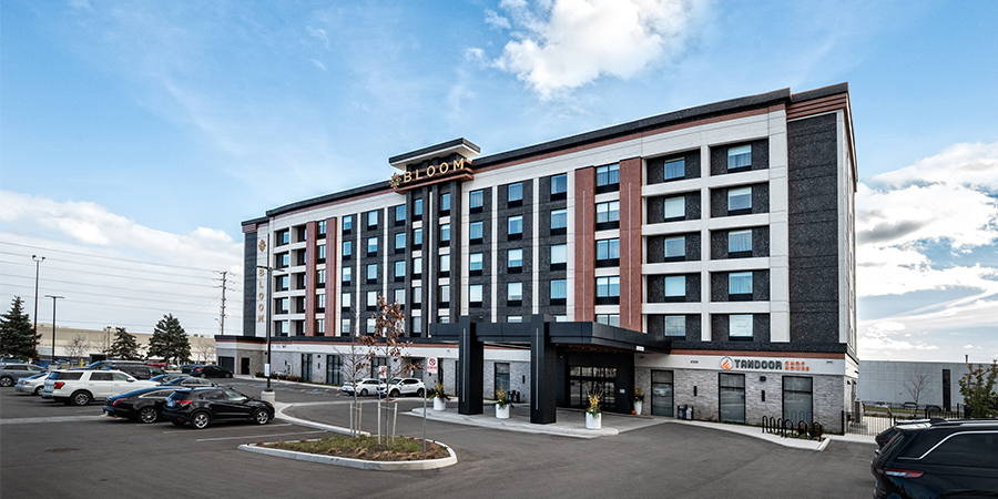 The Bloom Boutique Hotel utilizes a prefabricated exterior and insulation system, split-face stone cladding and Aluminum Cladding to provide a cohesive and visually appealing building.